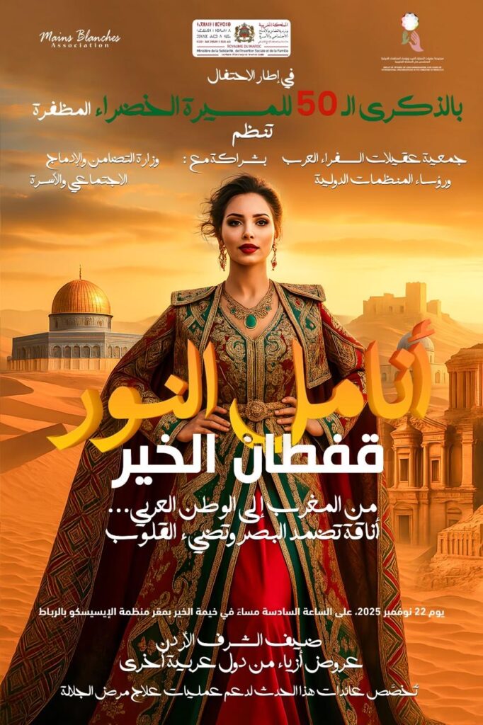 في إطار الاحتفال بالذكرى الخمسين للمسيرة الخضراء المظفرة، تستعد مدينة الرباط، بخيمة الخير في مقر *منظمة الإيسيسكو*، يوم *22 نوفمبر*، لاحتضان أمسية مميزة تجمع بين الأناقة المغربية والبعد الإنساني، من خلال حدث خيري تنظمه *جمعية عقيلات السفراء العرب ورؤساء المنظمات الدولية*، بشراكة مع *وزارة التضامن والإدماج الاجتماعي وجمعية الأيادي البيضاء.*