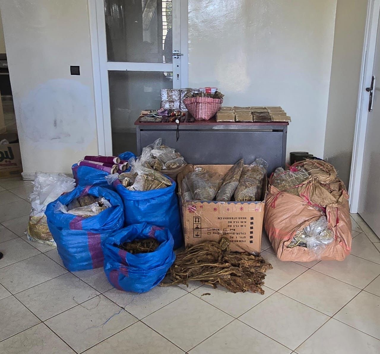 كما مكنت العملية من حجز كميات مهمة من المواد المحظورة، تمثلت في 19 كيلوغراما من مخدر الحشيش على شكل قطع وألواح معدة للبيع، و90 كيلوغراما من سيقان القنب الهندي، إضافة إلى 12 كيلوغراما من التبغ المجفف. وتم كذلك حجز مبلغ مالي يشتبه في كونه من عائدات الاتجار بالمخدرات، إلى جانب هاتفين نقالين (GSM)، وجهاز تسجيل فيديو رقمي (DVR)، وثلاثة كيلوغرامات من الأكياس البلاستيكية المستعملة في تغليف المخدرات.