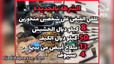 عاجل..الشرطة بالجديدة توقف شخص وسيدة متحوزين ب8 كيلو و200 غرام من الشيرا و50 كيلوغرام من الكيف وكمية من التبغ المهرب و13 سلاحا أبيضا من بينها أربعة سيوف